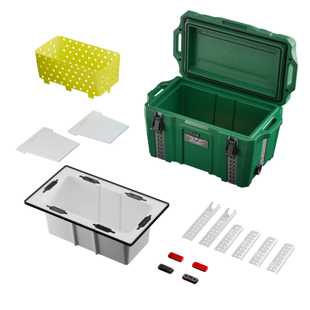 The Pilot Outdoors® Cooler Model 50/80 (Green) is perfect for your next fishing, hunting, or camping trip. It revolutionizes outdoor experiences with its patented separate ice compartment and ALWAYS DRY™ technology, tripling both storage and ice retention. This compact powerhouse offers a 2-in-1 size flexibility and an unparalleled up to 18-day ice retention, making it the ideal choice for extended adventures and large gatherings